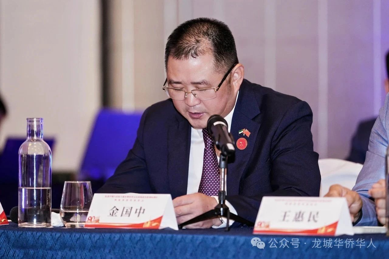 2025年8月15日下午,由阿联酋中国和平统一促进会、阿联酋中华工商总会、阿联酋上海总商会暨同乡会、阿联酋华侨华人联合会、阿联酋华侨华人妇女联合会联合主办的“铭记历史·缅怀先烈·珍爱和平·开创未来——纪念中国人民抗日战争暨世界反法西斯战争胜利80周年座谈会”在迪拜香格里拉大酒店隆重举行。中国驻阿联酋大使张益明、中国驻迪拜总领事欧渤芊、香港驻迪拜经济贸易办事处处长陈尚文,驻阿使领馆代表、阿联酋60余家侨团负责人、香港和台湾同胞代表、留学生代表以及各界嘉宾逾百人齐聚一堂,缅怀历史、共话和平。河南省侨商联合会海外顾问、阿联酋迪拜龙城华侨华人总商会会长金国中应邀出席并发言。