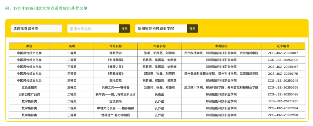 近日,第十九届中国好创意暨全国数字艺术设计大赛结果揭晓,郑州智能科技职业学院传媒学院师生凭借卓越的创意构思与扎实的专业技能,在国赛中斩获学生组一等奖2项、二等奖3项,教师组一等奖1项、二等奖4项、三等奖5项 ;省赛二等奖3项、三等奖3项、优秀奖4项,共计25项奖项。