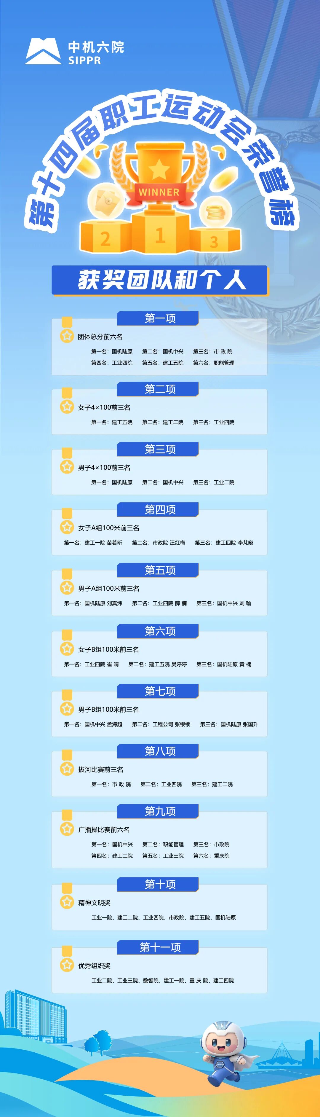 经过一天紧张激烈的比赛,国机陆原、国机中兴、市政院、工业四院、建工五院、职能管理获得团体总分前6名。