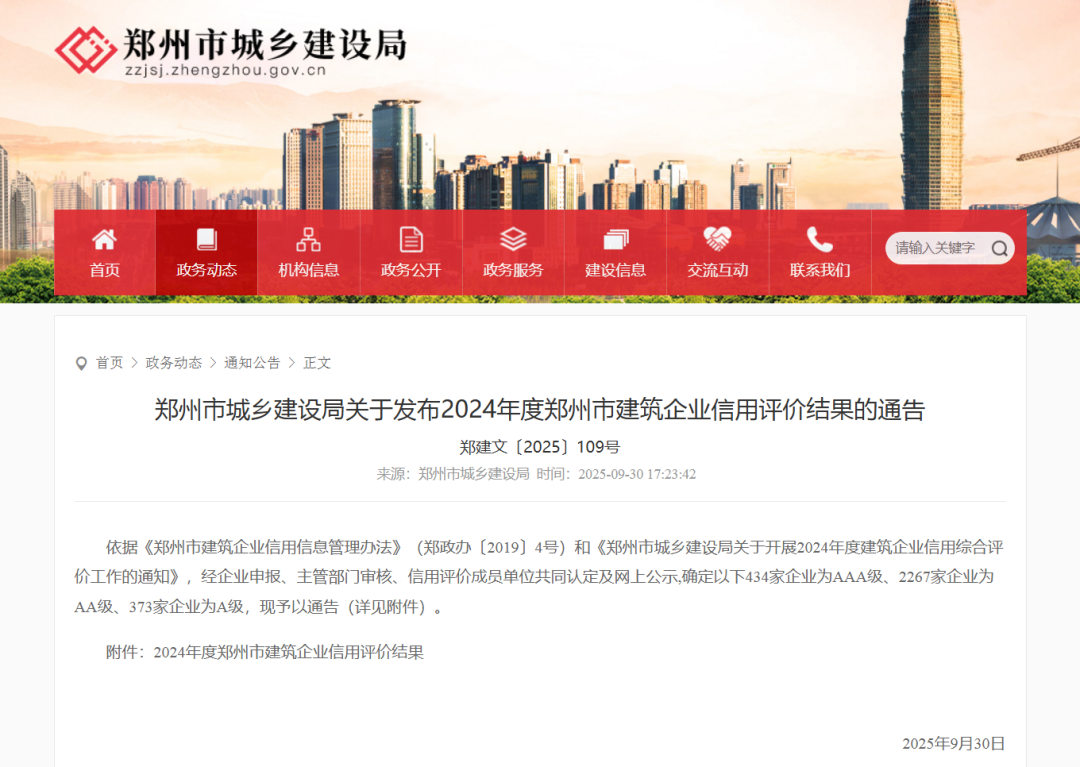 近日,郑州市城乡建设局发布《关于发布2024年度郑州市建筑企业信用评价结果的通告》(郑建文〔2025〕109号),新蒲建设集团有限公司凭借深厚的行业积淀、扎实的技术实力与优异的信用表现,在此次评价中成功斩获建筑工程施工总承包AAA级荣誉。