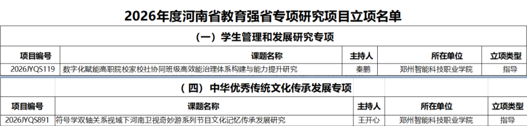 近日,中共河南省委教育工作委员会、河南省教育厅联合印发《关于公布 2026 年度河南省教育强省专项研究项目立项名单的通知》,河南省侨商联合会驻会执行会长单位郑州智能科技职业学院两项课题凭借扎实的研究基础与创新的研究视角成功获批。