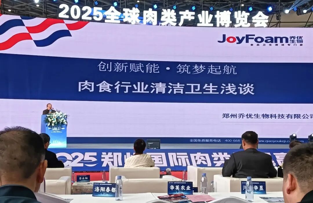 作为河南省肉类协会食品清洁安全分会会长单位,郑州乔优生物科技有限公司(以下简称“乔优公司”)总经理刘鹏为与会的企业和观众分享了题为“肉食行业清洁卫生浅谈”的专题报告。其在报告中结合了乔优公司智能化洗消的技术创新与应用,以及在上百家头部食品企业的实践案例,深度地剖析了当前肉类加工行业面临的微生物控制、清洁效率提升等共性痛点,并针对未来肉类产品清洗消毒的发展方向提出了具体建议,为肉类产业的卫生安全升级提供了切实可行的路径。