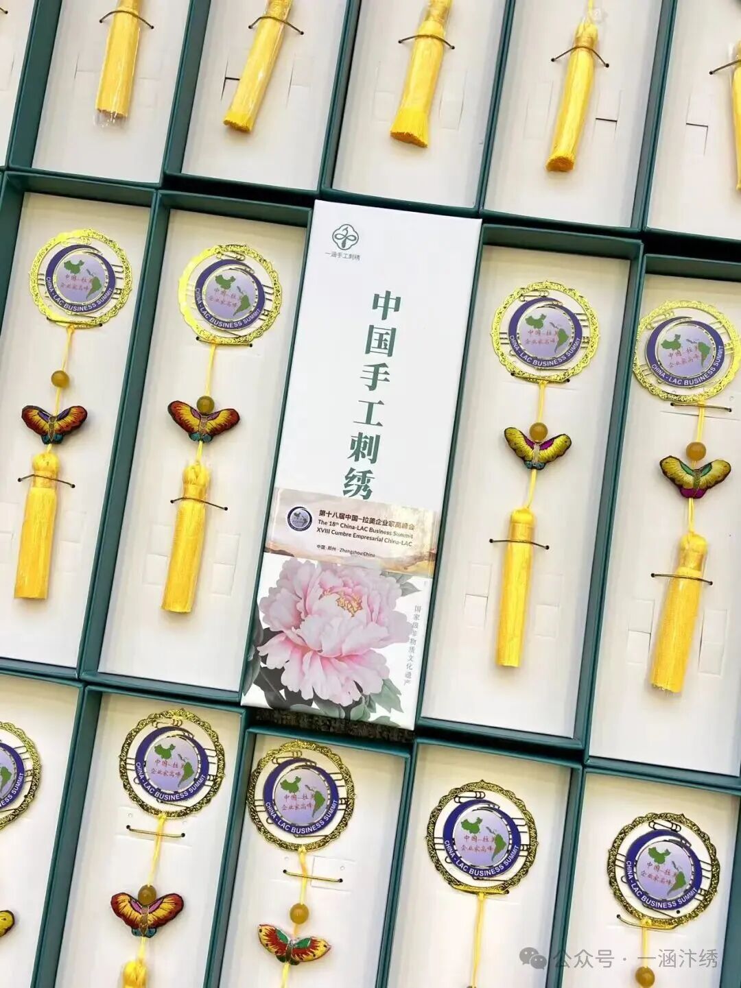 此次为高峰会精心打造的手工汴绣书签,每一枚均为一涵绣娘手工精心绣制。书签纹样细腻、色彩雅致,深度融汇传统汴绣技艺精髓,巧妙融入第十八届中国—拉美企业家高峰会专属图案与标识,并配以手工刺绣蝴蝶结流苏穗,既彰显现代审美,又饱含“福气绵长”的美好寓意,堪称融实用、审美与收藏价值于一体的艺术珍品。