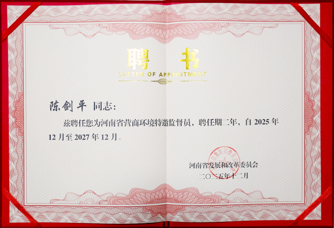 近日,河南省发展和改革委员会正式启动2025—2027年度营商环境特邀监督员选聘工作。河南华东电缆股份有限公司党支部书记、董事长陈剑平成功入选,获聘为该批次特邀监督员。此次选聘经多部门联合推荐、综合复核并公示确定,监督员队伍涵盖企业、学界、协会等多领域代表,旨在构建广泛参与的社会监督机制。