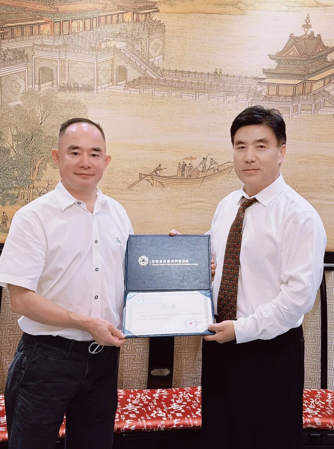会谈的一个高潮是隆重的赠礼与聘任仪式。李爱民部长代表云南侨联,向王泉成会长赠送了一份极具云南民族特色的珍贵礼物——彝绣。这幅色彩斑斓、工艺精湛的绣品,不仅承载着云南彝族人民的深厚文化,更象征着两地同胞血浓于水的深情厚谊。