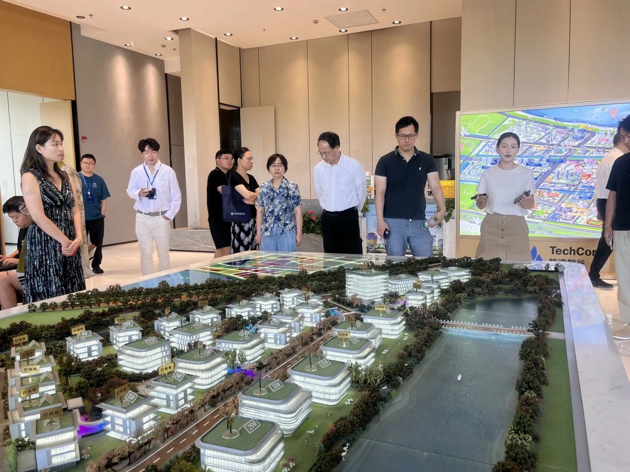 在海归小镇·传化科技城,通过专业讲解与视频介绍,考察人员深入了解了海归小镇的规划理念、产业布局与发展成就,科技城蓬勃的创新生态与清晰的产业定位给考察团留下深刻印象。