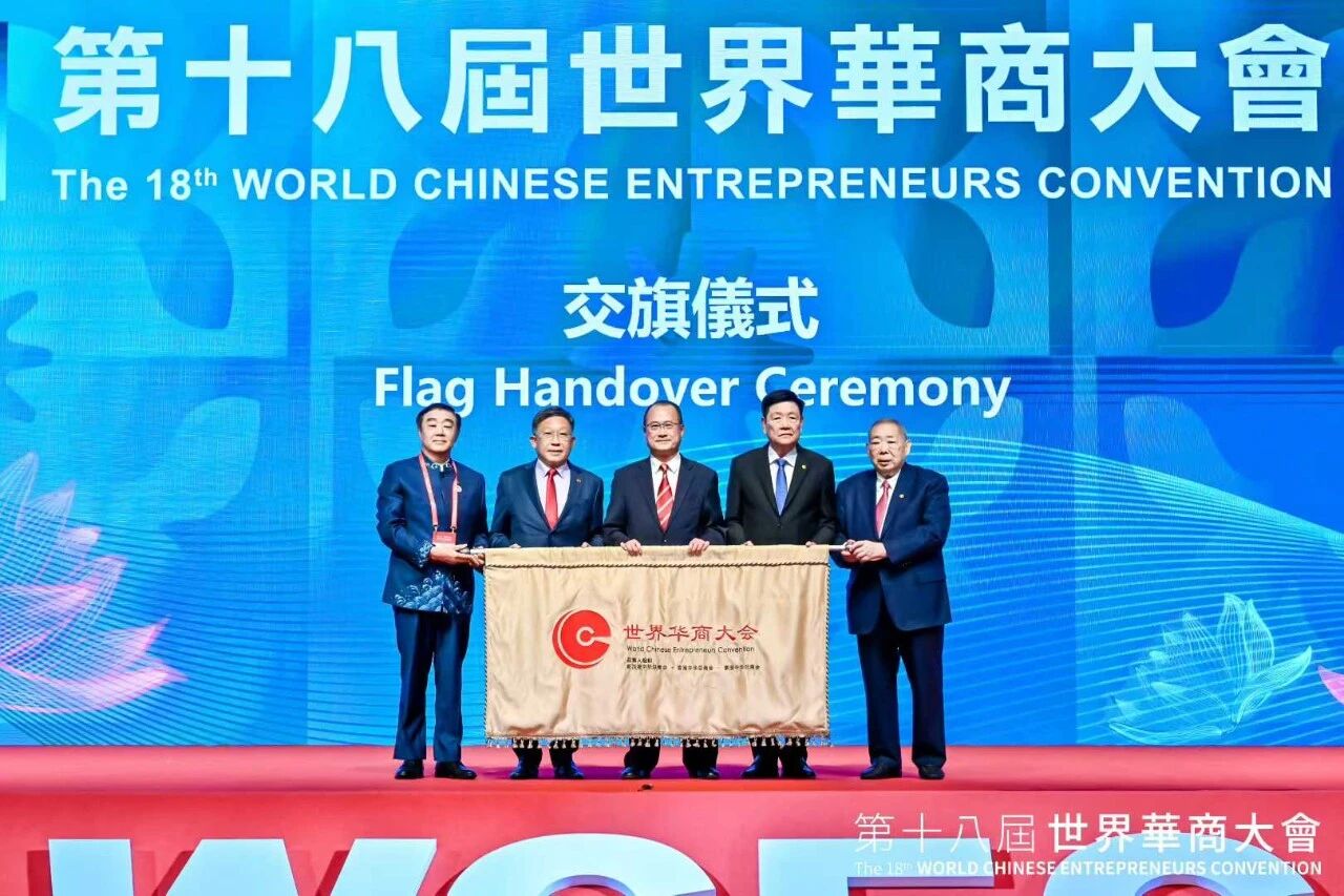 传承交接仪式成为闭幕式的重要亮点。泰国中华总商会主席林楚钦宣布,阿联酋中华工商总会获得第十九届世界华商大会主办权。他还宣布,从第十九届开始,恢复两年举办一届,第十九届世界华商大会将于2027年在阿联酋阿布扎比举办。随后,崔世昌、蔡冠深、高泉庆、林楚钦、唐振刚进行世界华商大会会旗交接仪式。
