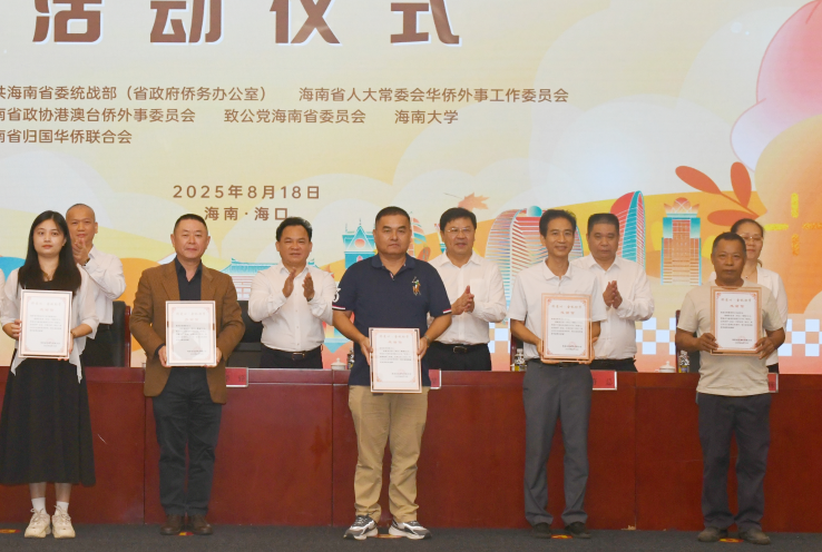 8月18日,由海南省侨联主办的2025年“侨爱心·金秋助学”活动仪式在海口举行?;疃殖。D鲜「笔〕だ罘?,中国侨联副主席、海南省侨联党组书记、主席梁谋等领导和嘉宾共同为此次参与捐款的侨界爱心社团、学校和企业的代表颁授感谢信台牌,向今年高考金榜题名的学子代表颁发奖助学金。我会符雄副会长出席活动,并代表我会向省侨爱公益基金会捐赠5万元助学金,助力侨界学子圆梦大学。