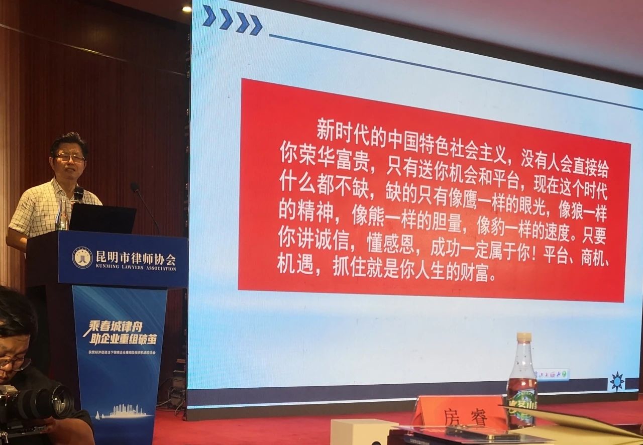 7月15日,为进一步认真贯彻《中华人民共和国民营经济促进法》,落实省发改委、省司法厅、省工商联、省侨联的工作安排,积极为民营经济困难企业提供更加优质高效的资源、信息、法律、金融服务,引导民营企业完善内部治理、借助市场化重组机制,以实际行动助力民营经济健康发展,由昆明市律师协会、云南省民营企业家协会、云南省侨商联合会联合主办的“乘春城律舟,助企业重组破茧——民营经济促进法下困境企业重组及投资机遇交流会”在春城昆明举行。昆明市律师行业党委书记胡昌坤、云南省民营企业家协会党委书记花泽飞、云南省侨联副主席万妍娟、经科部部长黄秋雁,云南省侨商联合会会长尹元江、名誉会长武克钢等领导、专家出席会议。