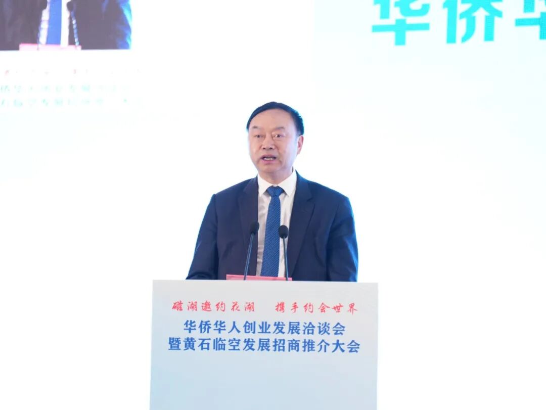 11月26日,第25届华创会暨黄石临空发展招商推介大会在黄石市举行?;剖形榧芹в⒉懦鱿⒅麓恰:笔∥痴讲扛辈砍に盏侣?,湖北省侨联党组成员、副主席王慧萍出席并讲话?;剖形笔榧?、市长吴之凌主持并颁发海外“双招双引”大使聘书。