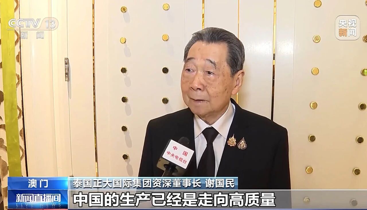 ▲CCTV记者专访谢国民集团资深董事长。他表示,中国的生产正在以一日千里的速度发展着,全面迈向高质量与AI人工智能?;诖?,我们非??春弥泄蠢锤呖萍嫉姆⒄骨熬?。